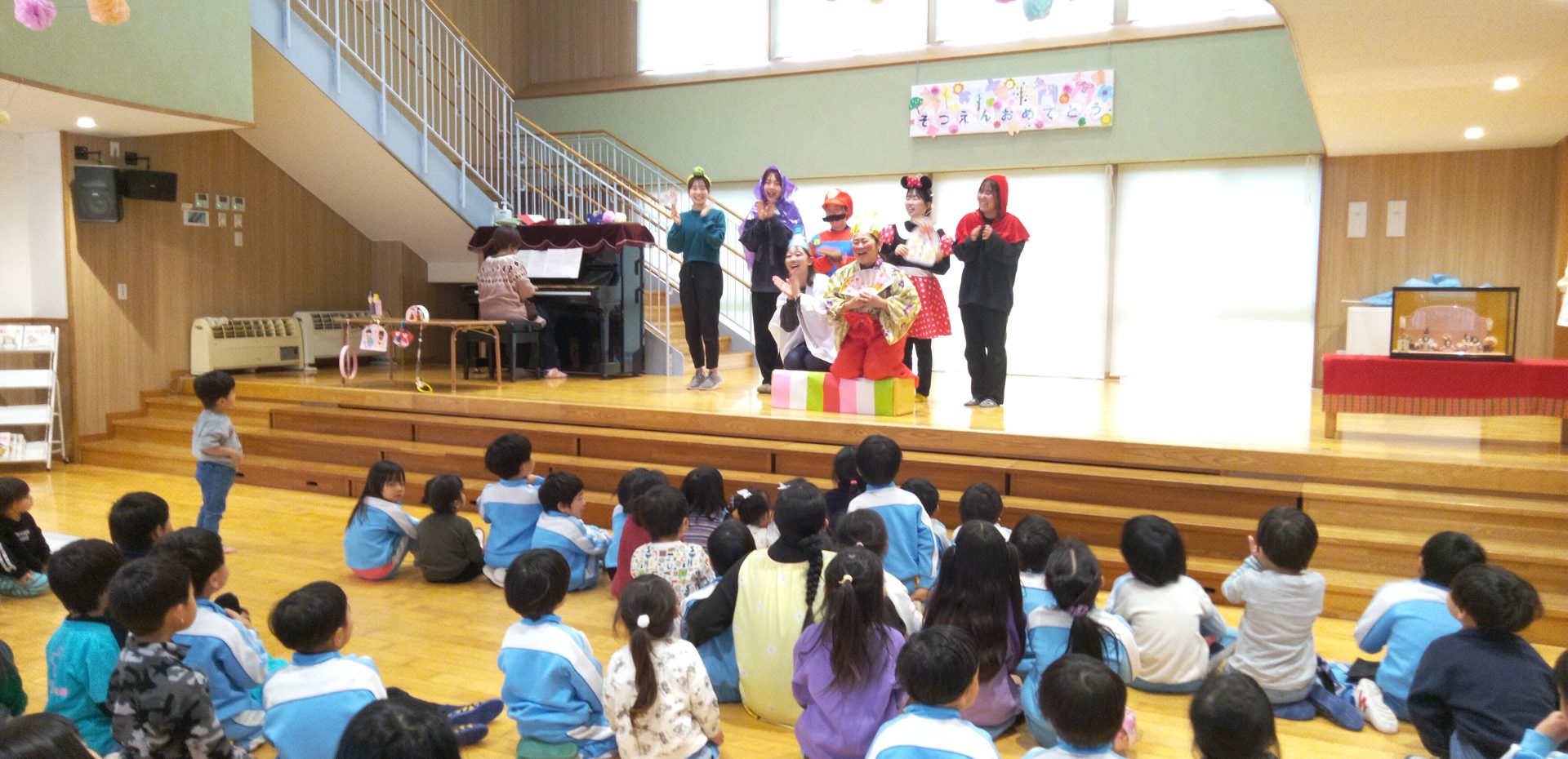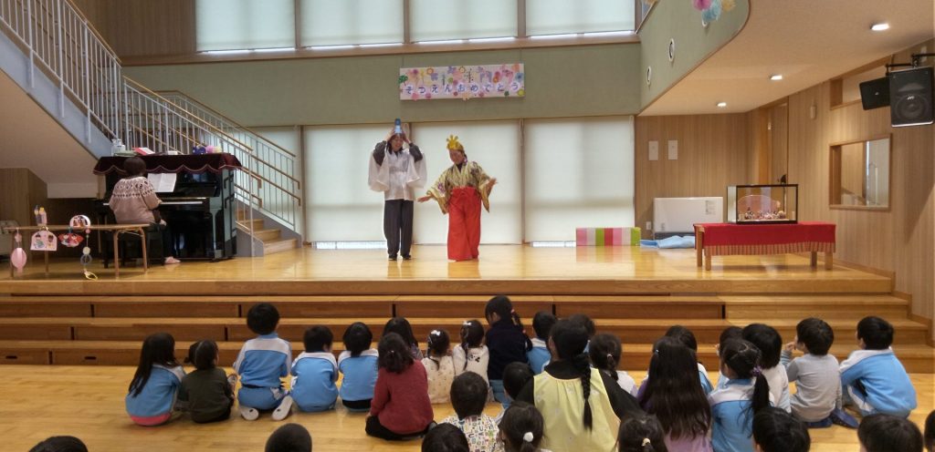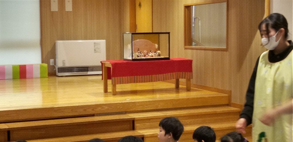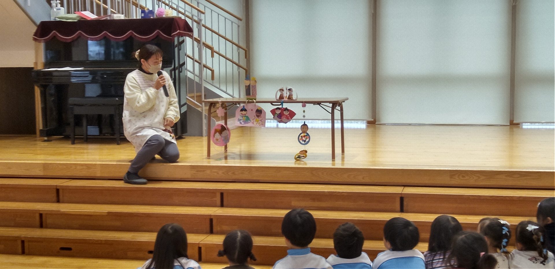 クラスで製作した雛飾りを紹介したり、先生達がオリジナルの劇『いなくなったおひなさま』で雛祭りの飾りの由来を教えてくれました。