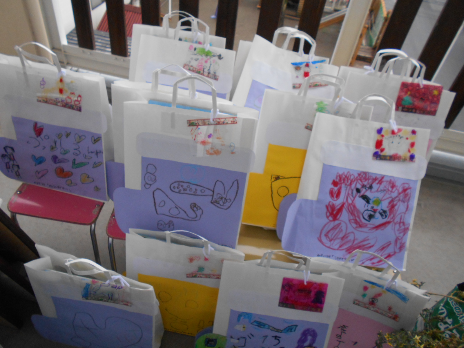 サンタさんが帰ってクラスに戻ってってみると、なんとこれまで製作で作ってきた靴下のバッグにプレゼントが届いていました!