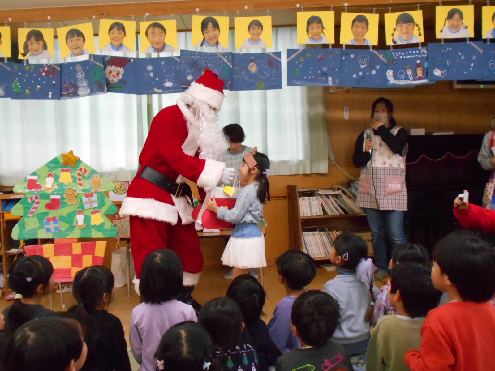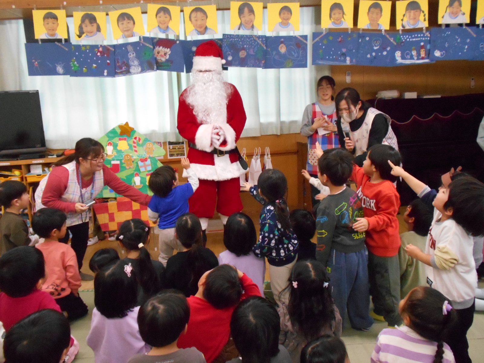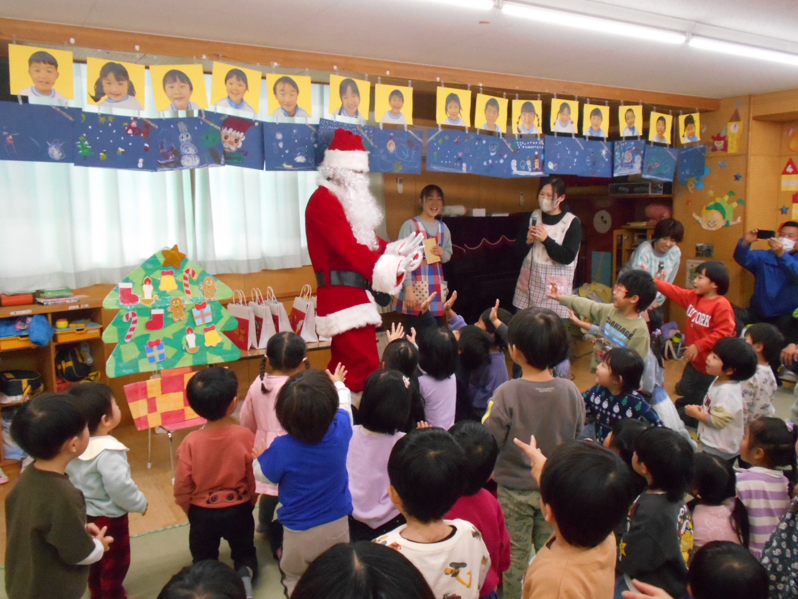 先生たちによるハンドベルの演奏を聞いたりクリスマスにまつわるクイズをしているとこども園にサンタさんがやって来てくれました。