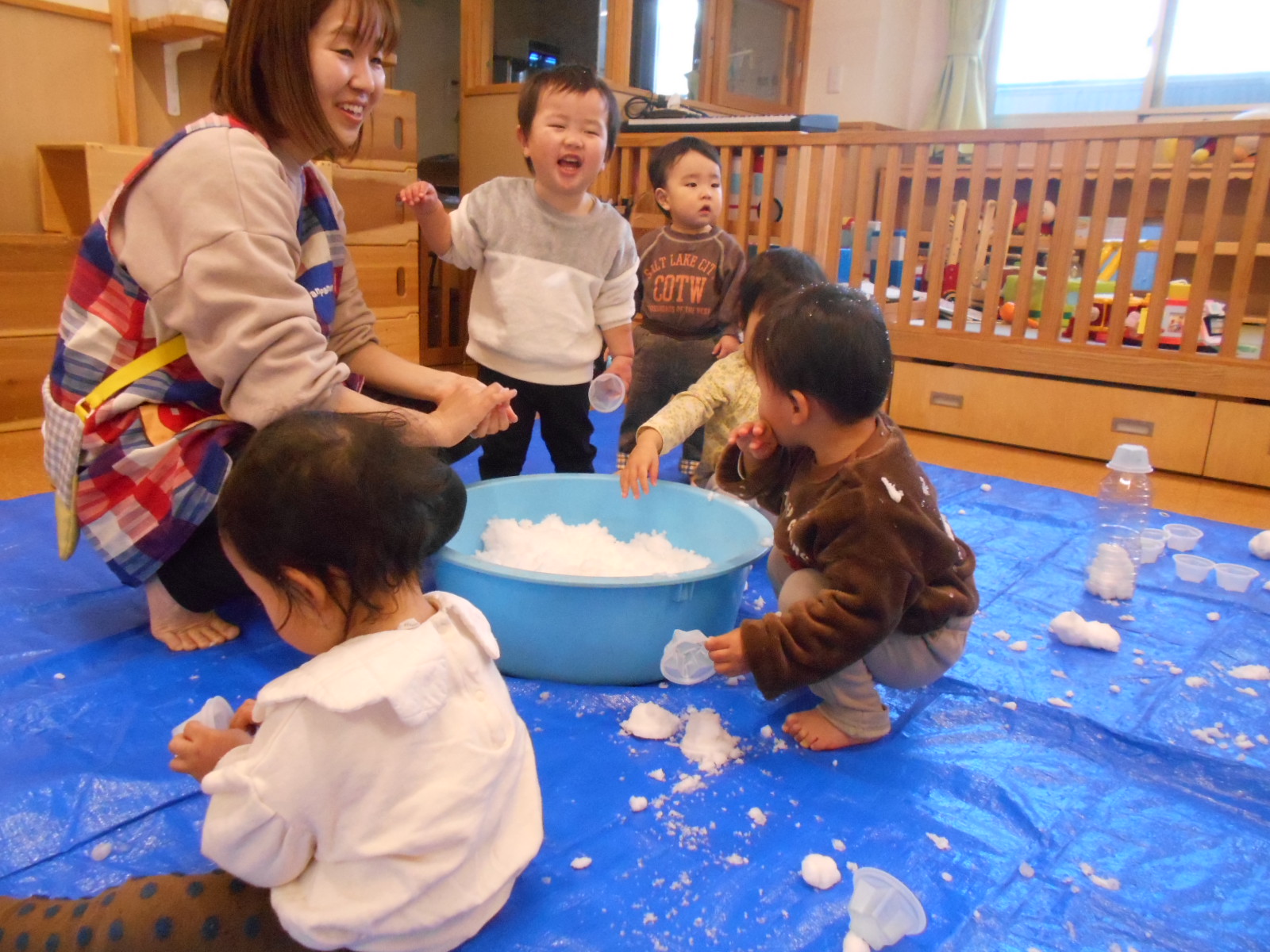 写真は子ども達が外遊びに出る前のものですが、子ども達も残った雪で思い思いに遊んでいました。