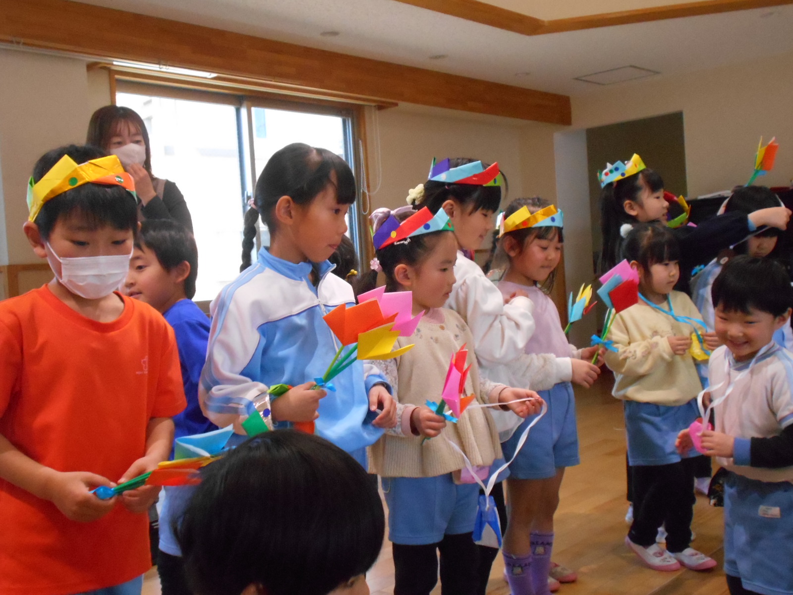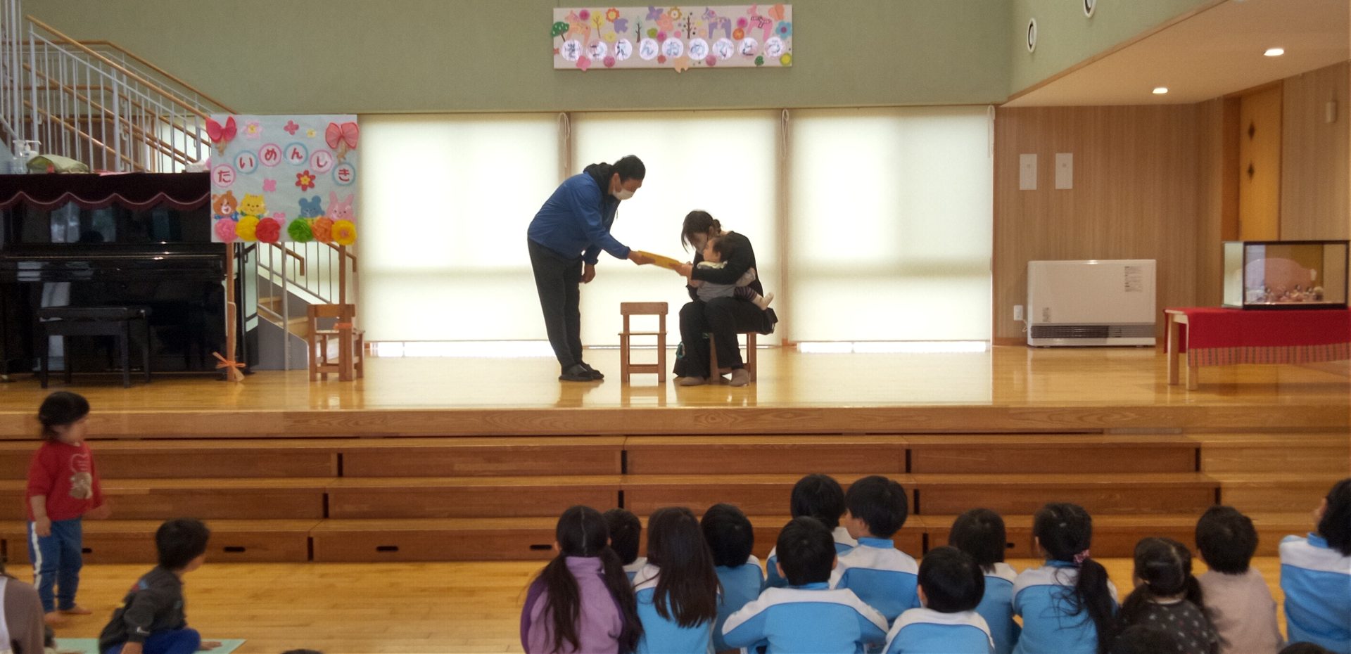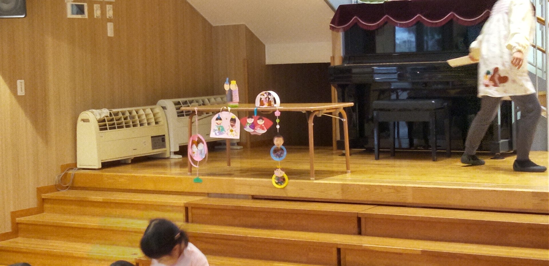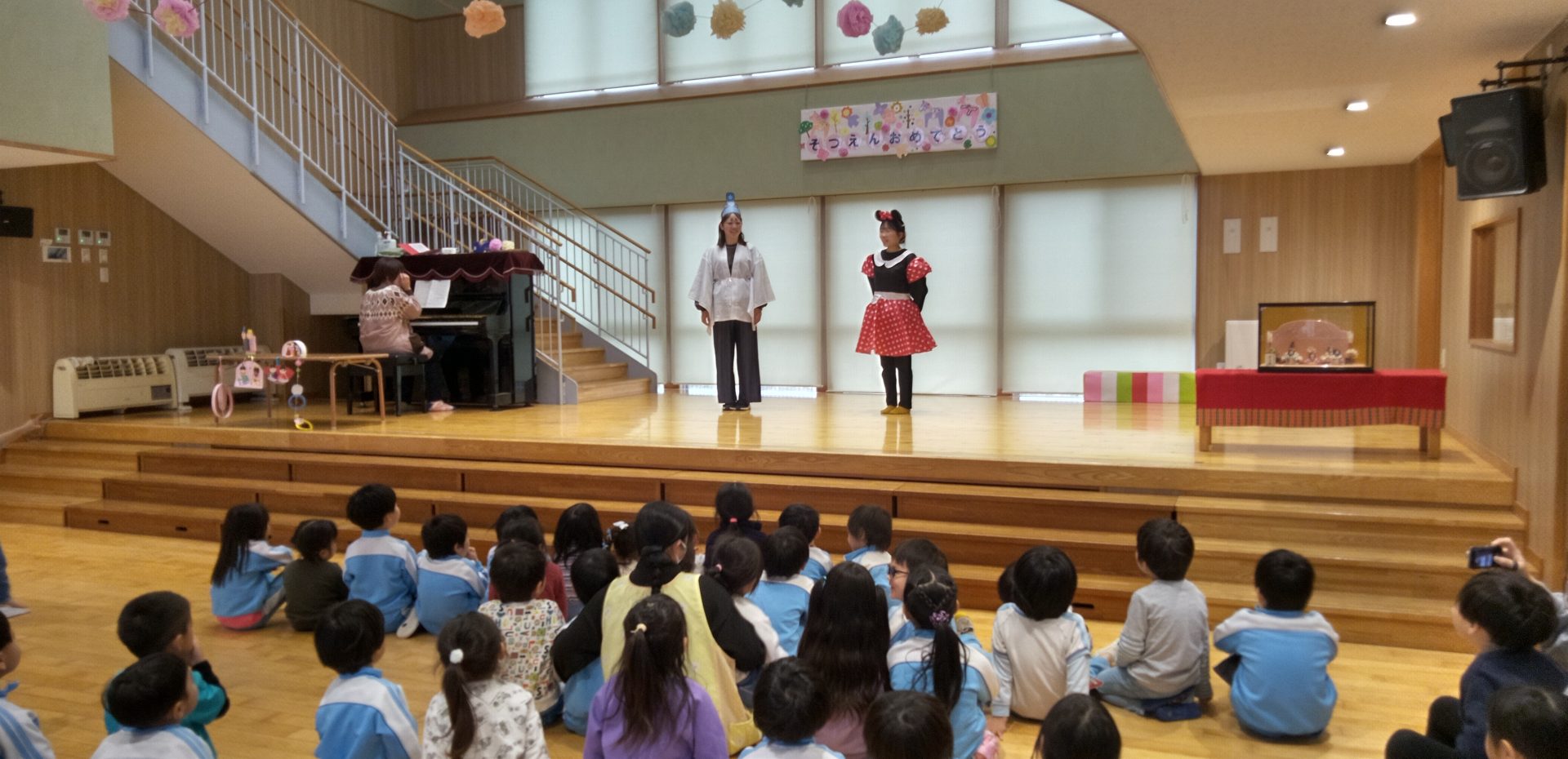 クラスで製作した雛飾りを紹介したり、先生達がオリジナルの劇『いなくなったおひなさま』で雛祭りの飾りの由来を教えてくれました。